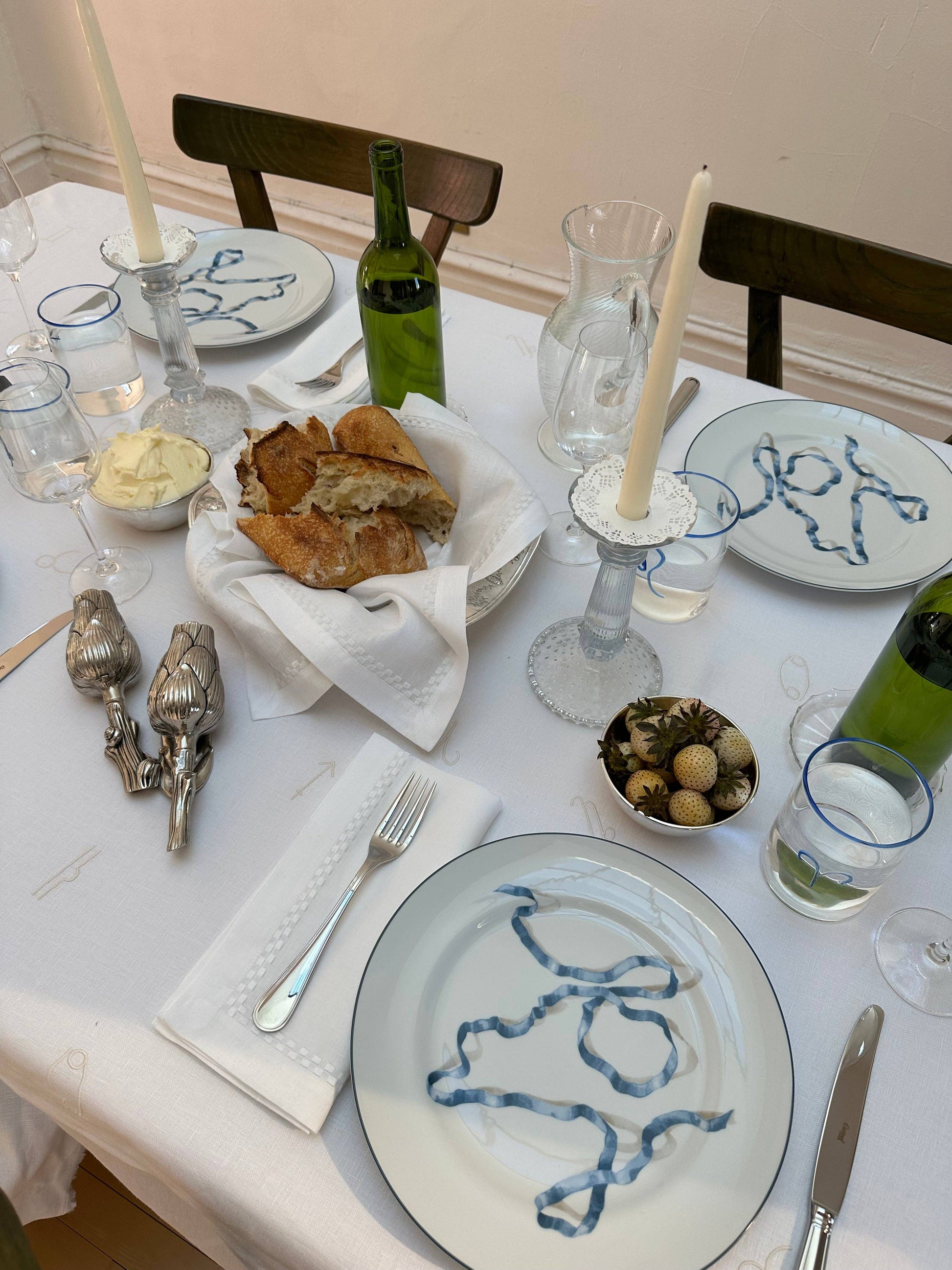 Up your tablescape game with these elegant Ribbon Dinner Plates designed by AD100 designer Adam Charlap Hyman. The delicate ribbons on the plates, hand painted by artist Pilar Almon, are inspired by a series of prints made in the 17th and early 18th centuries. In the botanical illustrations, the ribbons bear the names of individual varieties of lemons, limes, oranges, bergamots, and grapefruits.